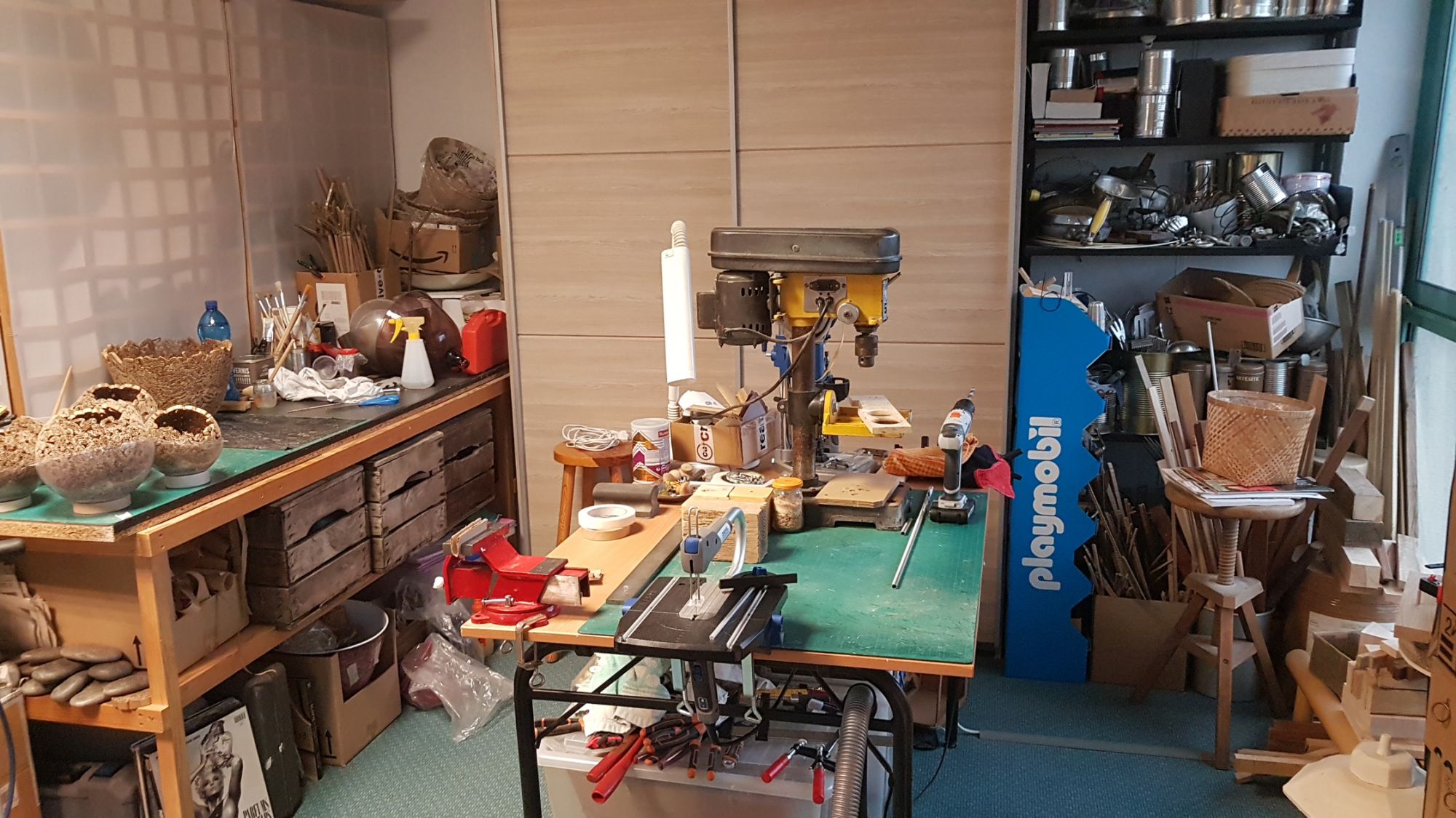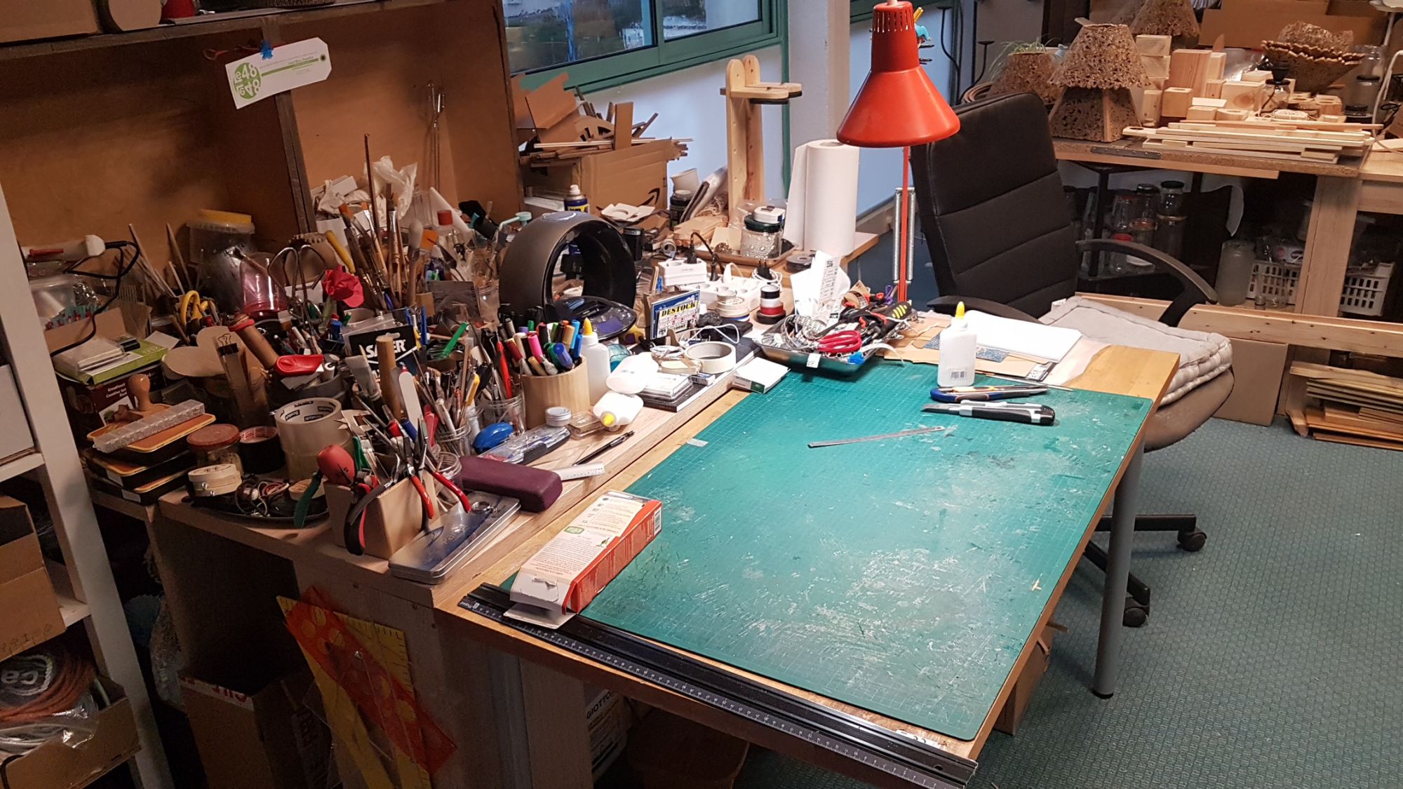 Dans mon atelier de création, j'élabore, à partir de matériaux de récupération, différentes créations originales avec beaucoup de patiente, je sélectionne le carton, je le découpe, le colle (colle à bois et pas au pistolet à colle ni colle chaude) ensuite il doit être poncer, recouvert de papier kraft et enduit de plusieurs couche de vernis colle. Place aux finitions...